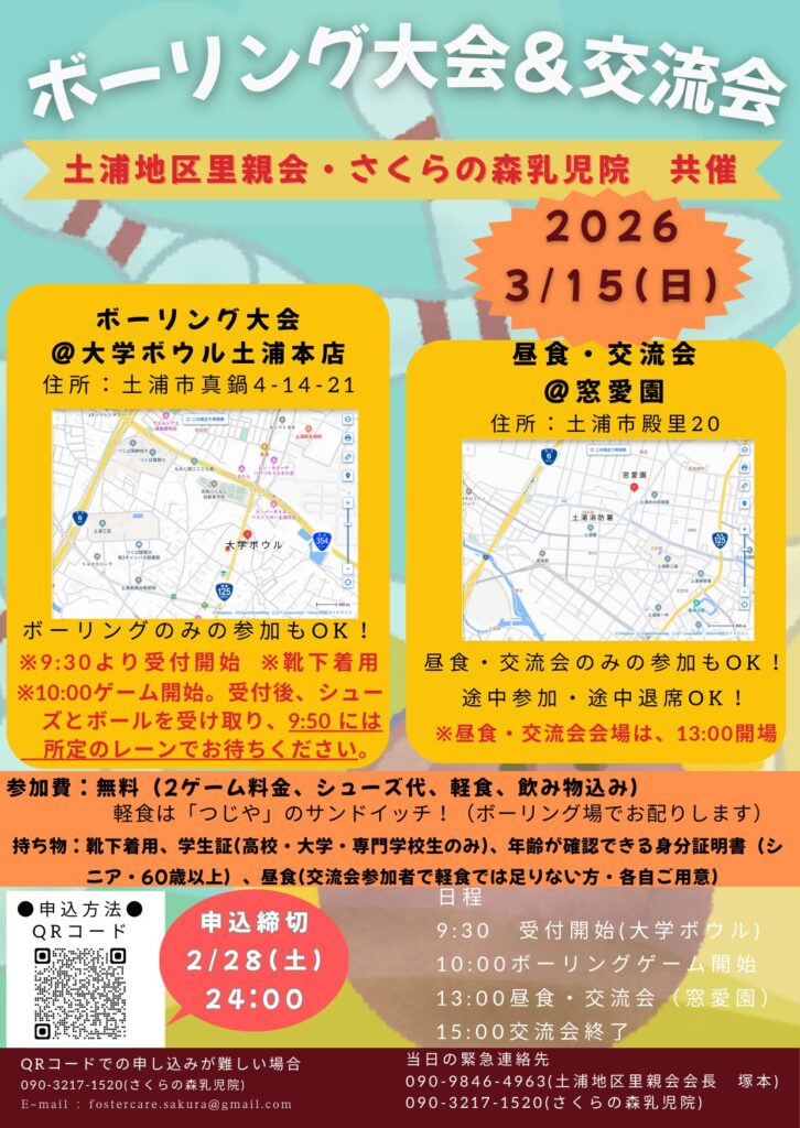 2026.02.19 土浦地区里親会 土浦地区里親会 ボウリング大会のお知らせ 関 英子 土浦地区里親会とさくらの森乳児院の共催によるボーリング大会のご案内です。詳しくは、チラシをご覧ください。 本年度最後のサロンとなりますので、みなさんの参加をお待ちしています。